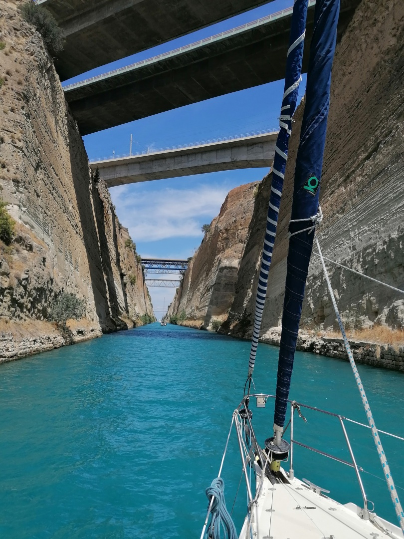 Je contacte, sur le canal 11, "Isthmia Pilot", et j'indique mon numéro de réservation, et le montant payé (238 €, ce qui est relativement cher pour seulement 3 milles de longueur. Le Canal de Suez nous a coûté à peine plus cher, pour 50 milles!); on nous met en attente avec 5 autres bateaux, puis le signal du passage est donné vers 11h30.