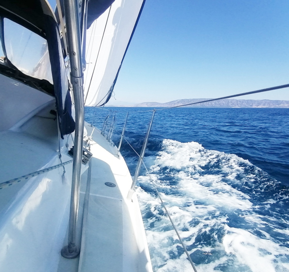 Petite étape pour commencer, vers le mouillage de Korfos. Nous hissons les voiles, le vent très modéré soufflant du nord-ouest, et nous partons au près. Ces conditions très clémentes permettent à Sylvie et à Frédéric de s'essayer à la barre. Mouillage vers 16h15, baignade, descente à terre, et petite visite de la ville.