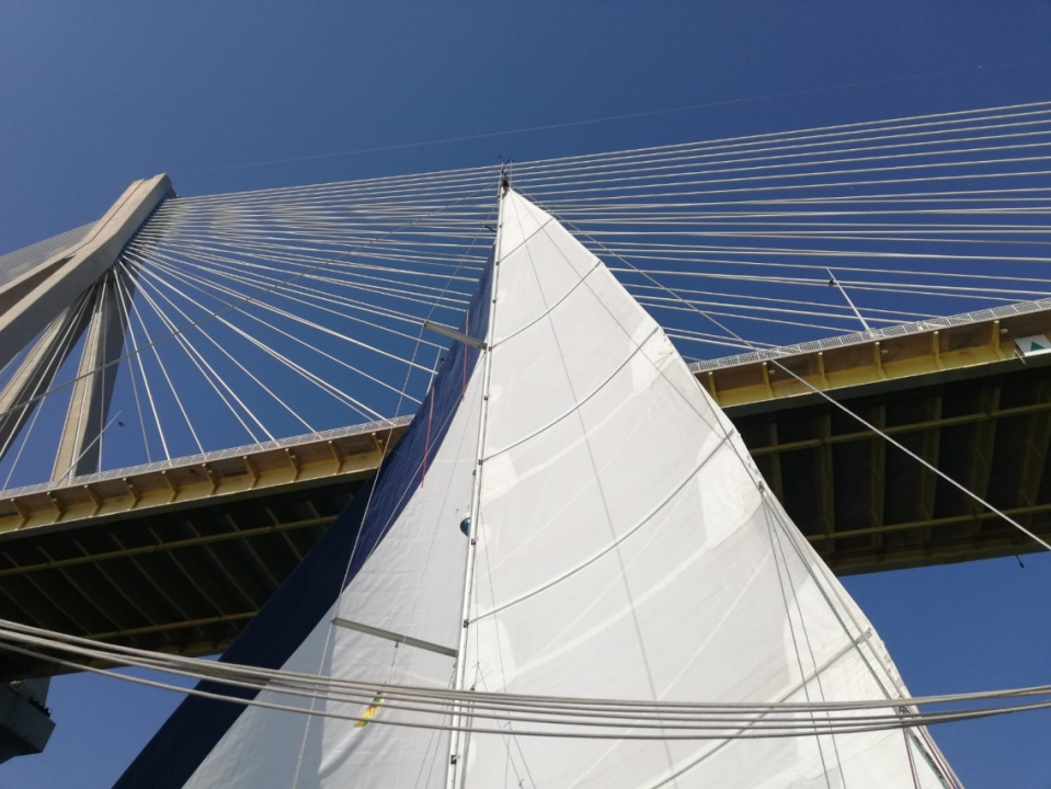 09 juillet : nous quittons notre mouillage devant Naupacte, et nous dirigeons vers le pont de Patras. Navigation au portant, et nous sommes conduits, pour bien faire marcher le bateau, à mettre les voiles en ciseaux, le génois étant tangonné.