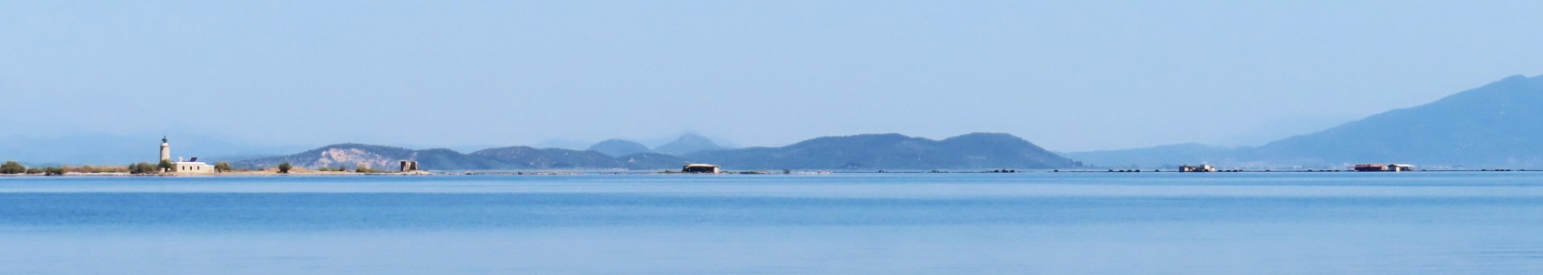 Après le pont, toujours poussés par le vent, nous pénétrons dans le golfe de Patras, bordé sur sa rive nord par une zone d'étangs côtiers et de marais salants. Ce paysage plat repousse loin vers l'horizon les reliefs montagneux.