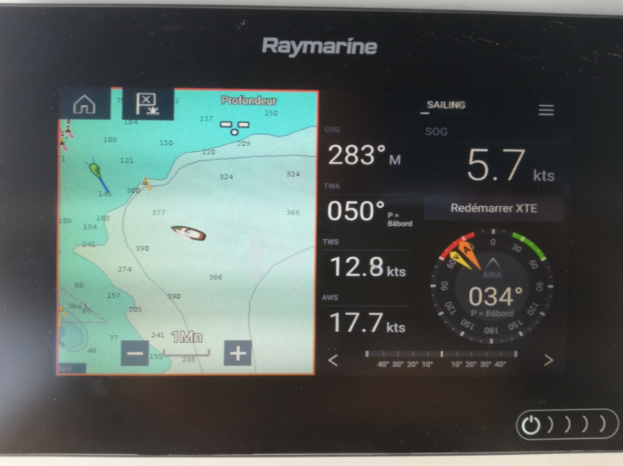 vitesse au près : 5,5 noeuds, à 50° du vent réel , pour 12 noeuds établis
