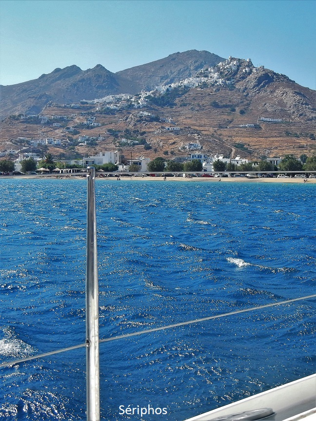 02 Août: navigation grand largue, jusqu'à Sériphos. Un peu de moteur quand le vent faiblit en milieu de journée, mais il reprend à nouveau dès le début d'après-midi, jusqu'à force 6.