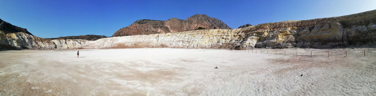 Nisyros est une île volcanique, le volcan étant encore en activité. Sur la plage qui jouxte le port, où nous passons un moment l'après-midi, les petits galets ont la particularité surprenante de flotter si on les jette dans l'eau : il s'agit bien sûr de pierre ponce !