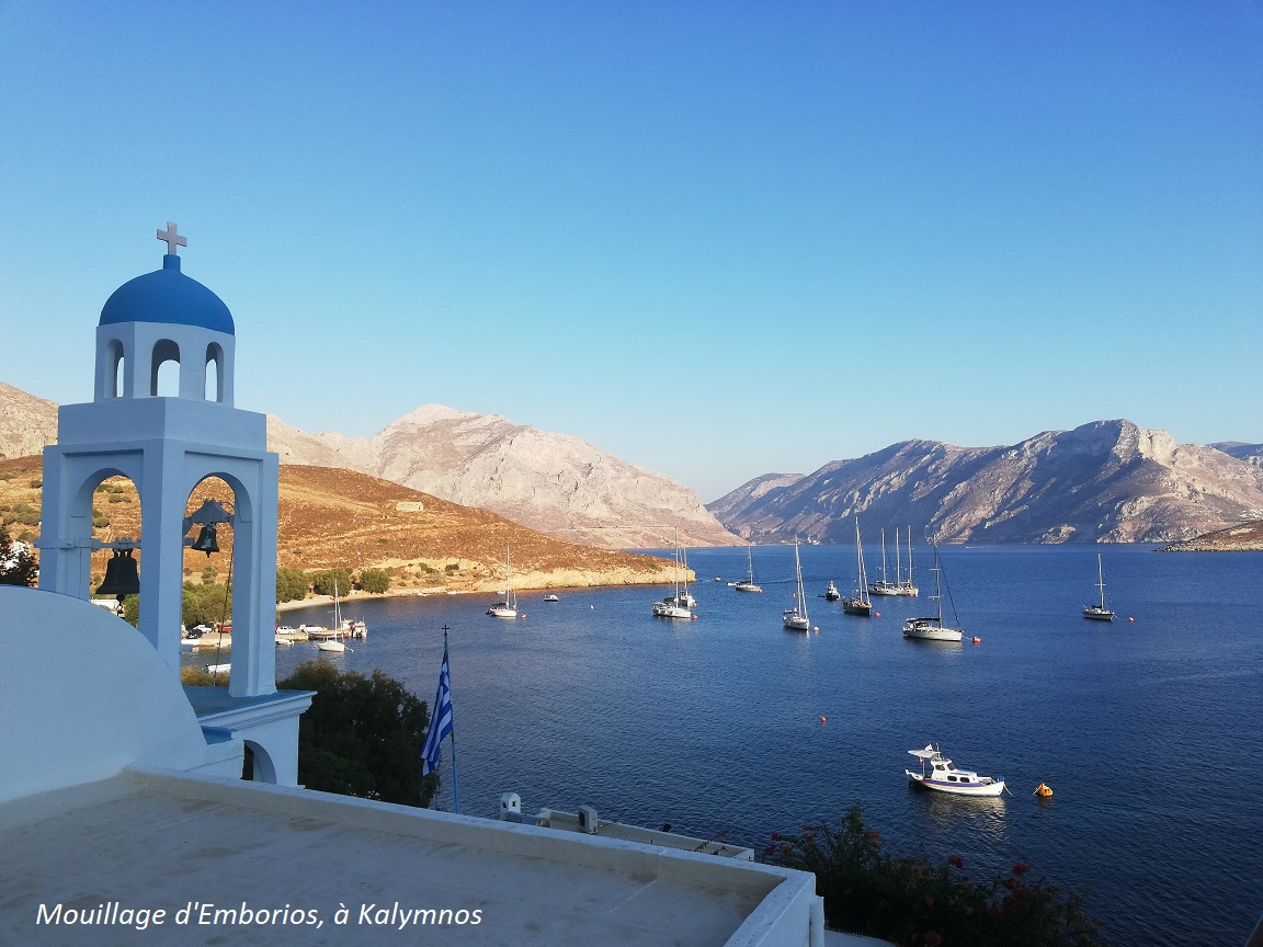 du 14 au 16 Août : Navigations tranquilles, au moteur surtout. Le vent nous a accompagné en quittant Lévitha, puis il a nettement faibli plus à l'est, dans des parages qui nous rapprochent des côtes turques. Nous faisons escale successivement à Léros, au mouillage de Lakki, toujours aussi calme, à Kalymnos, dans la splendide baie montagneuse d'Emborios, et enfin à Kos, où nous nous amarrons dans la marina.