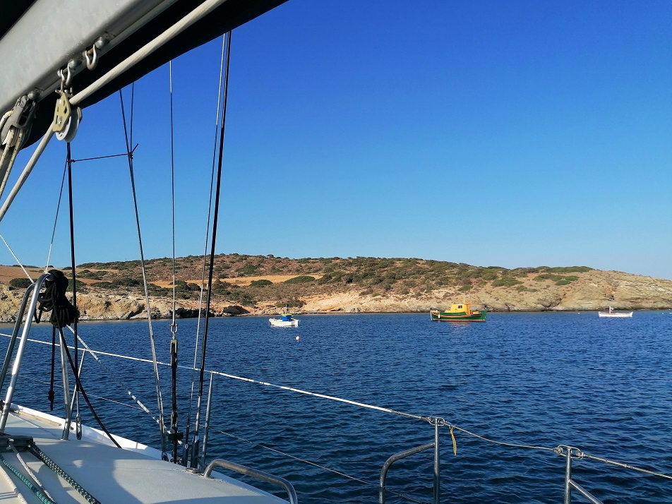 Mouillage dans la baie de Livadhi, délicat car l'ancre a du mal à crocher sur ce fond de sable et d'herbes. De plus, la baie, bien abritée de la houle, est balayée par les rafales de Meltem. Cela semble finalement tenir à notre deuxième essai... Le vent souffle en soirée, nous interdisant de descendre à terre, et il ne faiblit pas la nuit.