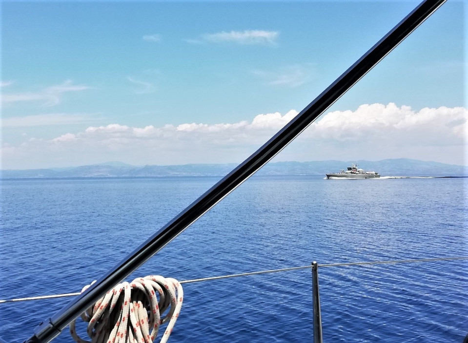 Nous croisons des vedettes garde-côtes grecques, qui sont basées en grand nombre au port de Mytilène, et qui patrouillent régulièrement dans le chenal.