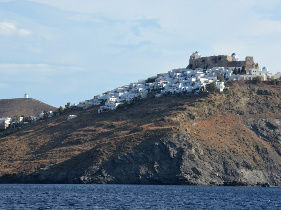 Le 14 juin, au lever du soleil, nous sommes en vue d'Astypalaïa, dont la citadelle se découpe au sommet d'une colline aride. Le mouillage d'Ormos Livadhi est paisible, et nous permet de profiter d'un agréable petit déjeuner, avant d'aller à terre visiter la ville.