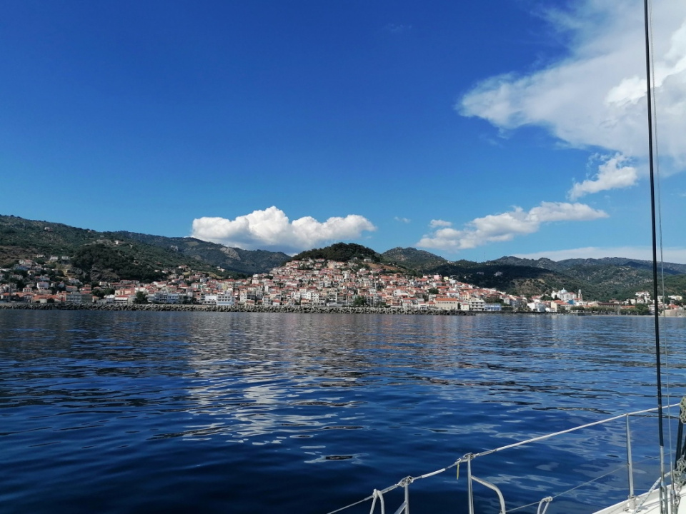 Le vent tombe malheureusement, et les nuages s'accumulent sur l'île de Lesbos dont nous approchons.