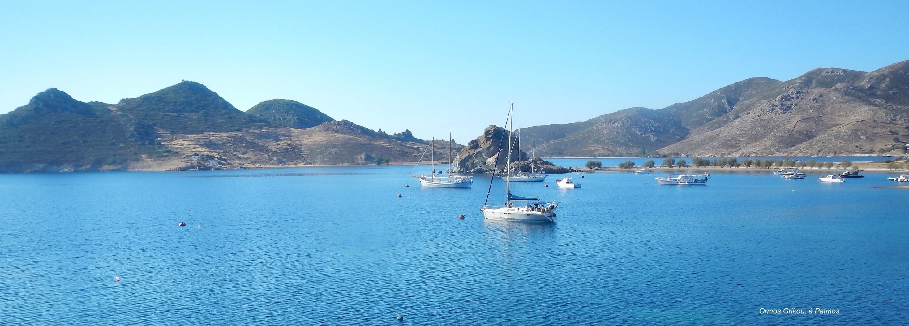 16 juin : Petite traversée jusqu'à Patmos, dans un meltem modéré, qui permet à Marie de s'essayer à la barre. Nous mouillons sur corps mort (payant) dans Ormos Grikou.