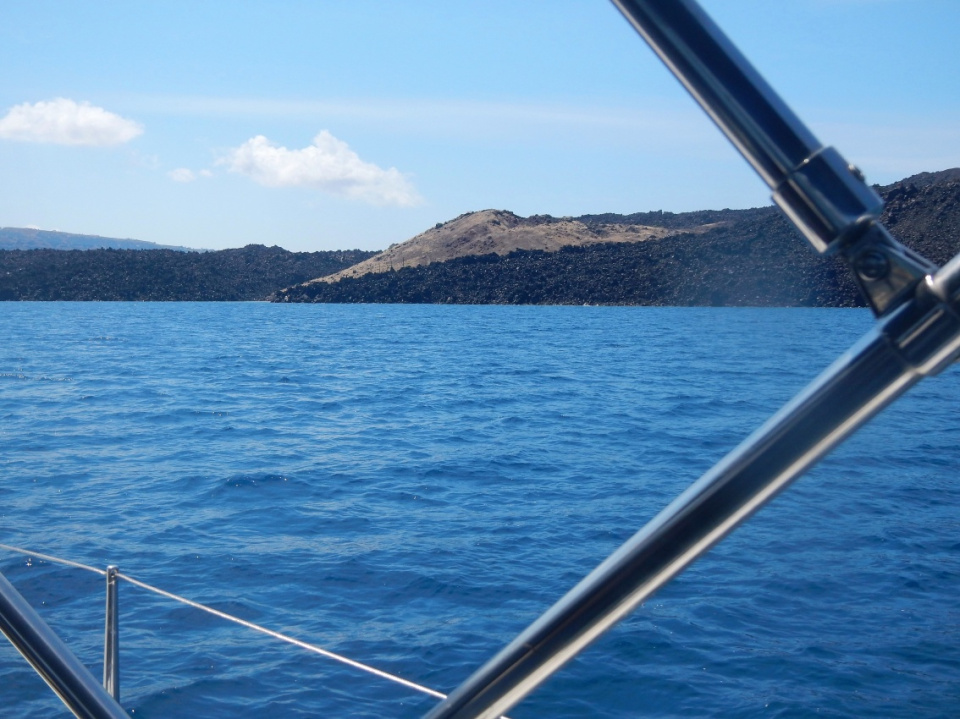 Par la petite passe du nord, nous pénétrons dans la caldeira, cratère effondré et envahi par la mer, depuis l'antiquité, et nous la traversons lentement.