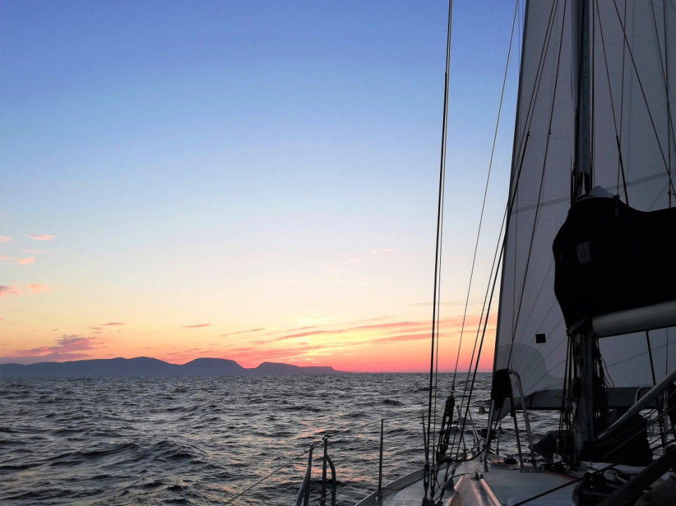 Dans ces conditions, nous pouvons conserver génois et grand-voile haute, ce qui nous permet de filer à près de 6 nœuds. De plus, le vent adonne progressivement, ce qui nous permet de remonter en route directe vers notre but .