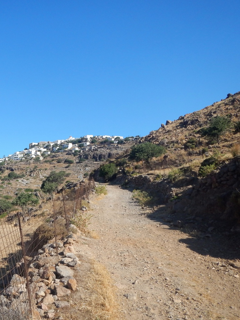 Après un bain rapide, nous débarquons, et attaquons la montée vers le sommet, sur le chemin pavé. Progression pénible sous un soleil encore accablant, mais joie au sommet en contemplant les horizons, plaisir de découvrir les moulins à vent sur leur crête, et moment de réconfort sur la terrasse d'une taverne...