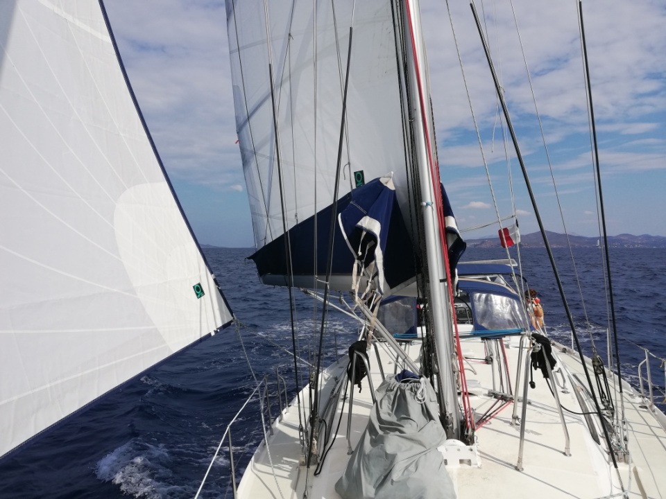 Pendant la matinée, le vent de Nord-Est, force 4, nous permet de filer au largue. Les voiles neuves font merveille ! Le vent baisse malheureusement lorsque nous descendons dans le sud, et nous sommes obligés de finir l’étape au moteur.