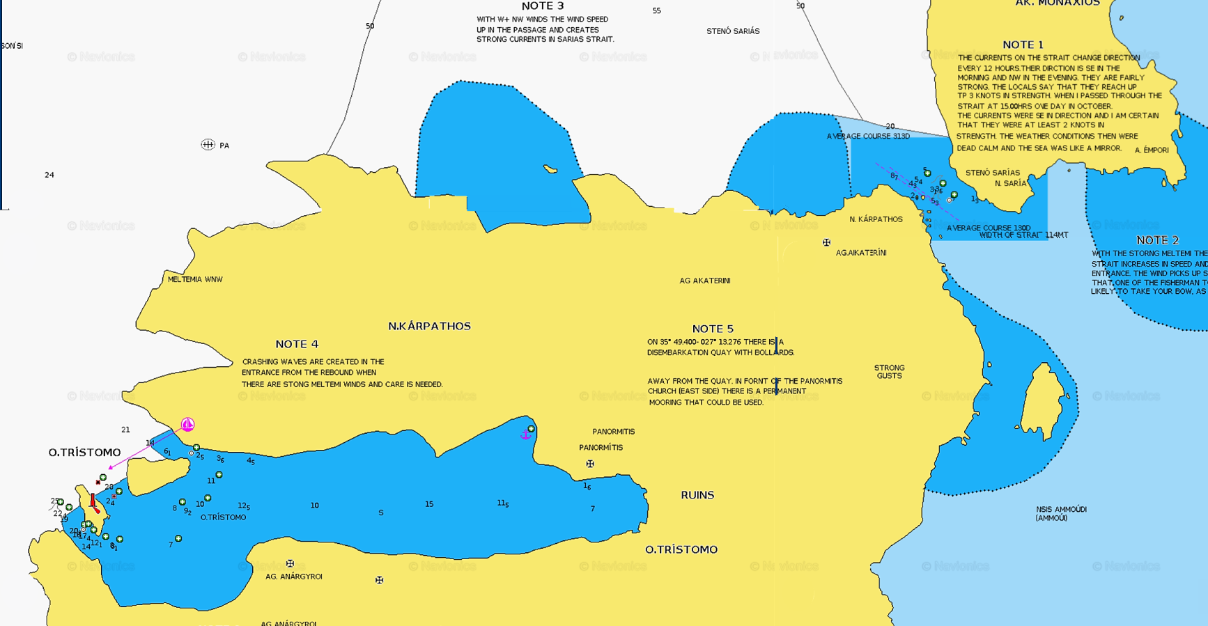 Nous nous présentons vers 15h à l'entrée du mouillage que j'ai choisi pour passer la nuit : Ormos Tristomo. L'étymologie du nom indique une baie "à 3 bouches", et effectivement, l'entrée est barrée par deux petits ilots plats, qui laissent 3 passages.