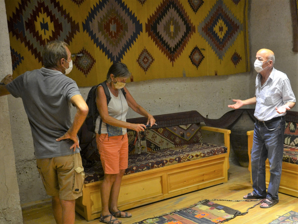 Le manager du magasin d'Avanos nous rejoint à l'hôtel, et nous explique dans un français parfait, ce que nous pouvons faire et voir en Cappadoce. Notre programme est établi pour les trois jours qui viennent. En attendant, il nous invite à visiter son magasin, véritable musée, avec des tapis et kilims anciens, reliques de plusieurs siècles pour certains.
