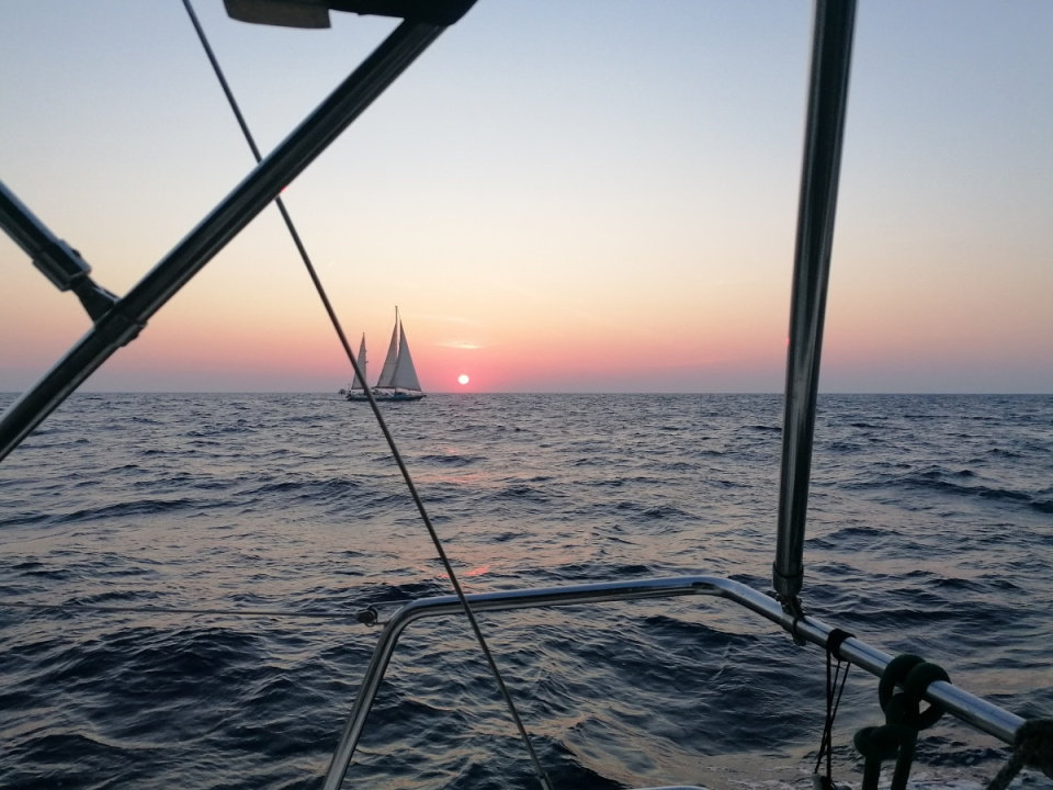 Vers 14h, au milieu du Gofe de Squillace, le vent tombe, et passe progressivement à l'ouest. Bientôt, il forçit, et nous pouvons repartir sous voiles, jusqu'à tombée de nuit.