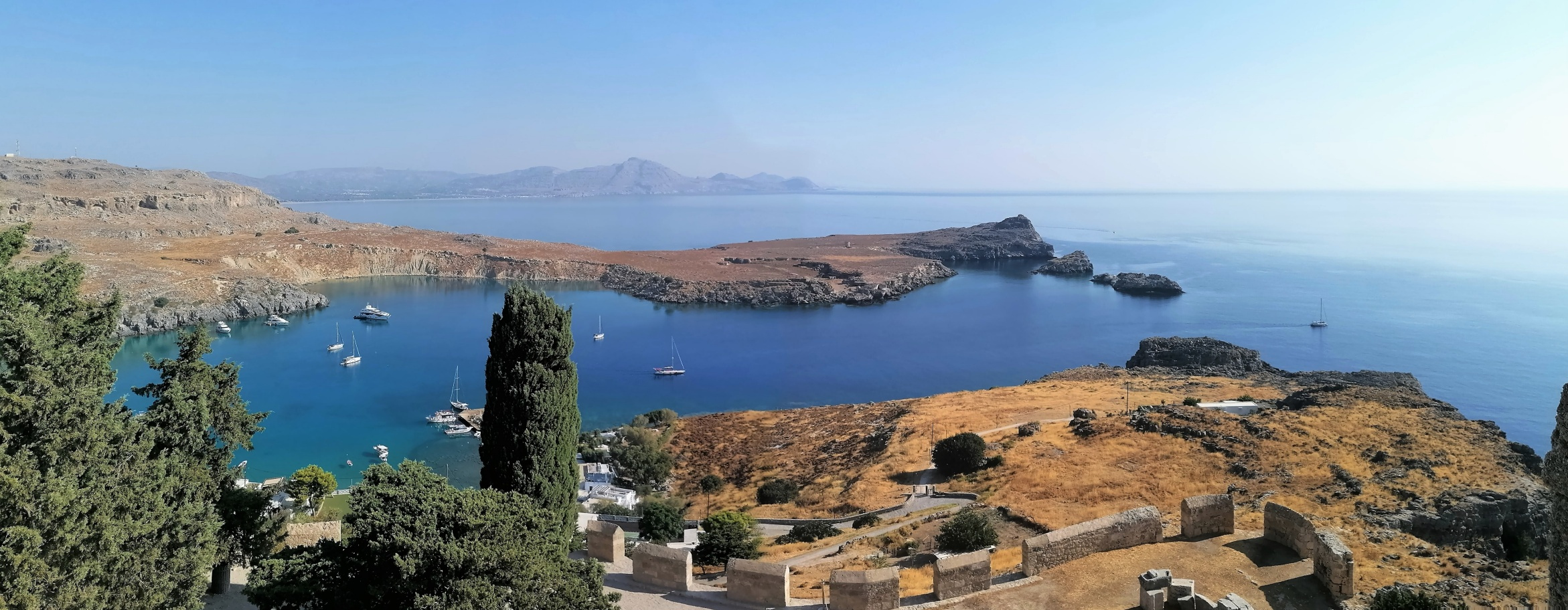 Un vent modéré de sud-est nous fournit l'occasion de tester la nouvelle voile réparée. Essai concluant, puisque nous parvenons à naviguer à 4 nœuds, dans seulement 6 nœuds de vent. Le vent forcit un peu, et nous approchons rapidement de la baie de Lindos, où nous mouillons vers 16h30, sous l'acropole antique.
