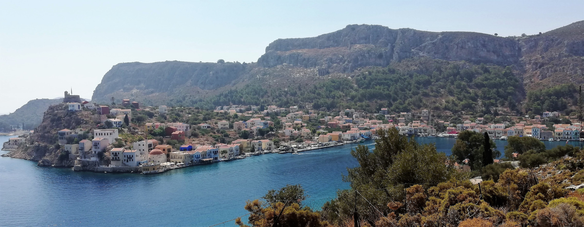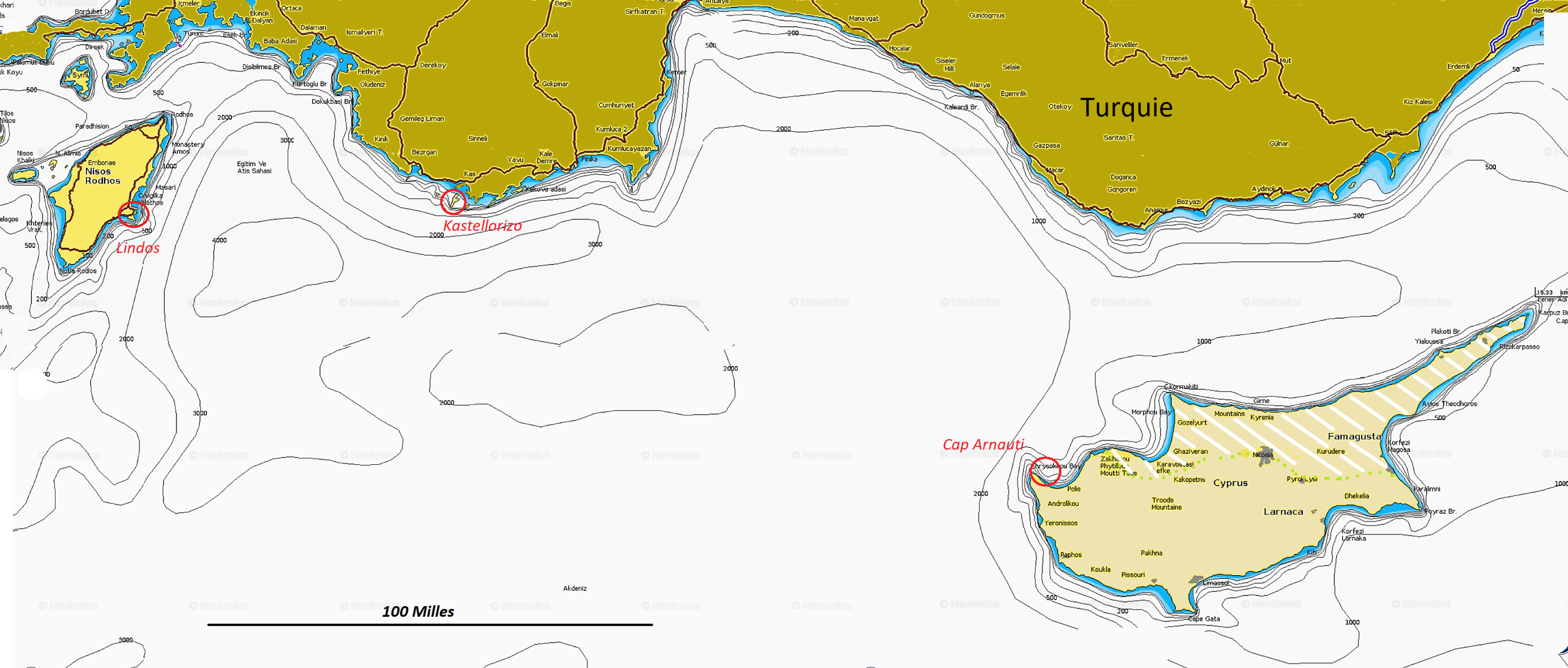 Nous resterons là 2 nuits, pour profiter pleinement du site magnifique, et pour nous préparer à la suite du voyage: ce sera d'abord, une traversée jusqu'à la dernière île, la plus orientale, de la Grèce, Kastellorizo ; ensuite, une deuxième traversée jusqu'à Chypre, que je prévois d'atteindre par sa pointe la plus proche, le Cap Arnauti, derrière lequel nous pourrons nous abriter. Les vents dominants doivent être d'ouest, probablement modérés, si bien que le gennaker devrait nous être très utile.