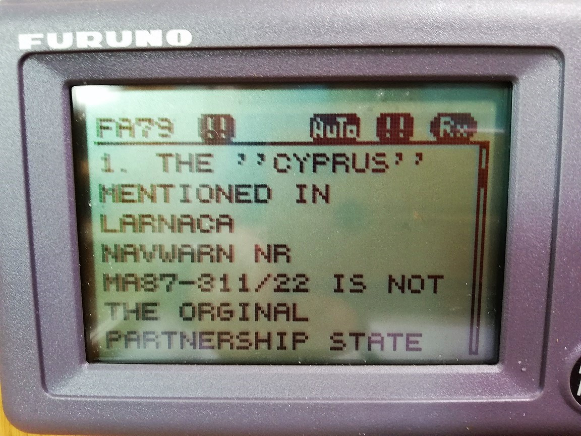 Avant d'éteindre les appareils, je vérifie comme d'habitude les messages reçus sur le Navtex, et je découvre celui-ci, émis le jour même par la station turque d'Antalya :