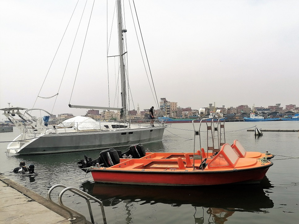 19 Avril : Dans un véhicule envoyé par Mohamed Mohsen (notre contact du Suez Canal Authority), nous parvenons à Ismaïlia peu avant midi. La route a été sans histoire, simplement marquée par un arrêt pour des courses d'avitaillement, qui nous a permis de remplir le coffre de la voiture. Nous découvrons Tahenkat, autour duquel s'affaire déjà une équipe de plongeurs. Ceux-ci vont commencer à nettoyer la carène (essentiellement gratter les coquillages qui y sont fixés), pendant que nous effectuons les formalités : douane et police, et paiement de la fameuse taxe de sortie-entrée dans la zone du canal (4000 livres égyptiennes, soit environ 120 €).