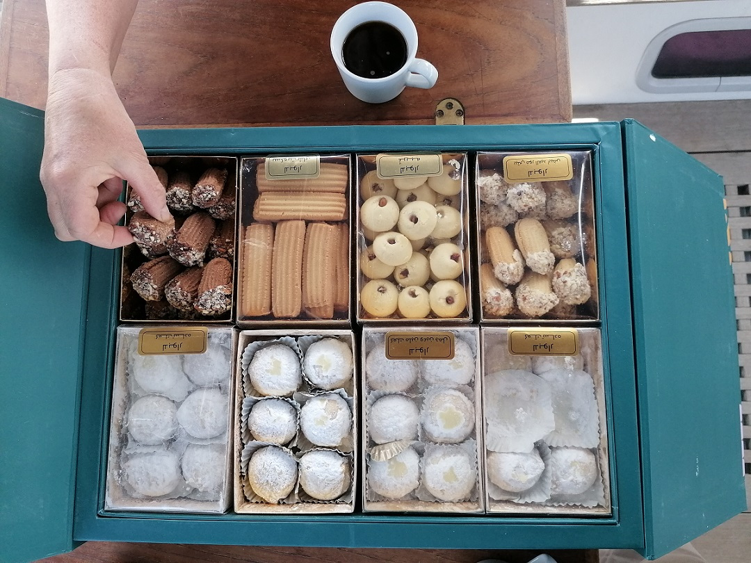 Par conséquent, extinction des feux assez tôt pour cette première nuit à bord, vers 20h30 ... Nous commençons à peine à glisser vers le sommeil quand quelqu'un nous interpelle depuis l'extérieur ! C'est Mohamed Mohsen, venu pour une visite de politesse, et tout décontenancé de nous trouver déjà couchés ! Nous l'invitons bien sûr à monter à bord, et il embarque, avec une énorme boite de pâtisseries, qu'il a voulu nous offrir. Nous nous installons dans le cockpit (obscur...) pour une conversation prolongée, bien agréable. Son français est toujours impeccable, et sa gentillesse confondante... Avant notre départ, il nous offrira même le repas au restaurant du "club", que son adjoint Nasser voulait nous imposer, suite à un malentendu...
