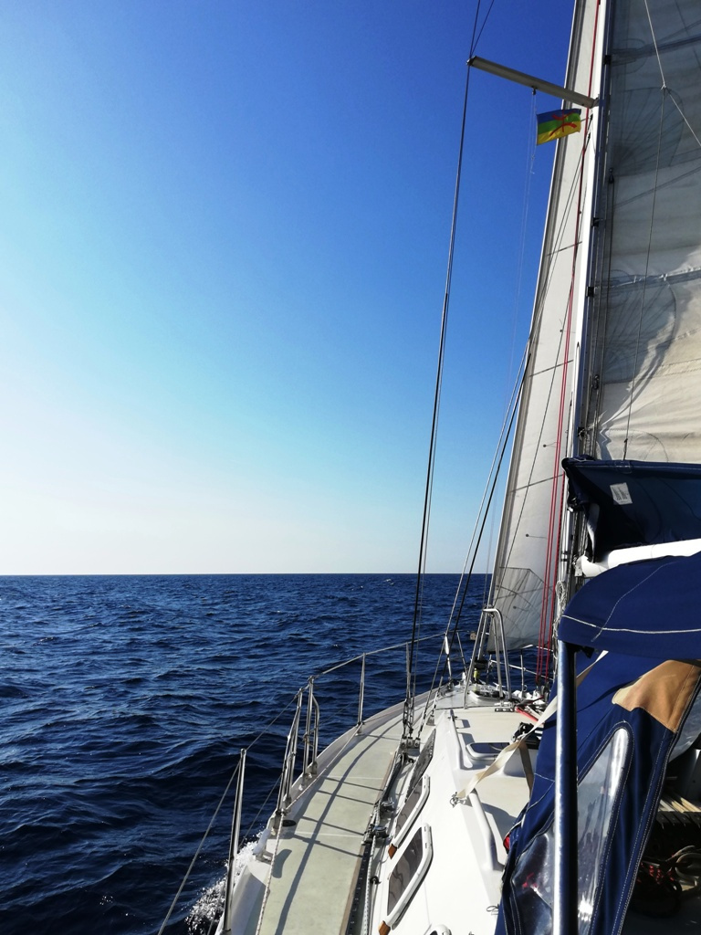 Après une accalmie au lever du soleil, le vent remonte à force 4, du nord-ouest maintenant, ce qui nous permet de renvoyer toute la toile, et de naviguer confortablement au grand largue.