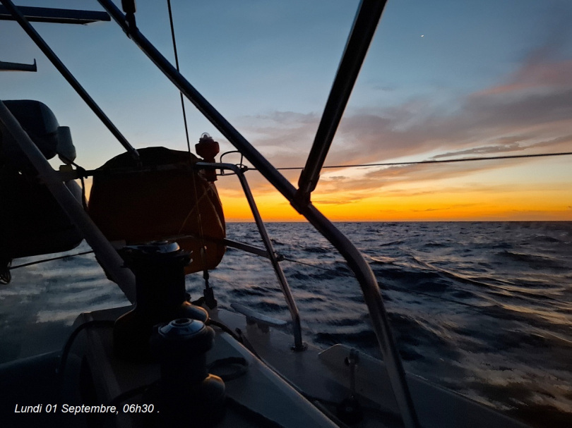 Nous poursuivons notre route en alternant les quarts, le sommeil étant difficile à trouver en bas, vu les conditions de navigation (tangage parfois brutal, et gite constante).