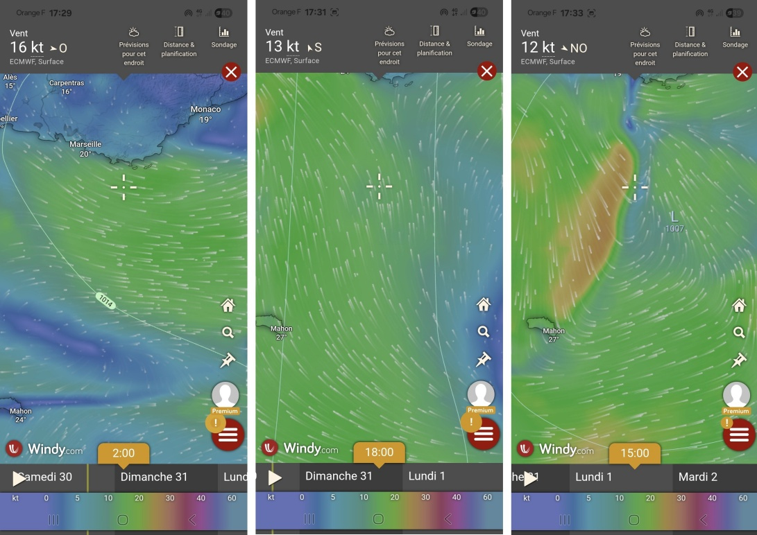 La situation météo sera un peu complexe : d'abord vent d'ouest dimanche matin, puis après un intermède calme, vent de sud l'après-midi, la nuit, et jusqu'au lendemain lundi matin, puis nouvel intermède calme, et enfin vent de nord le lundi après-midi.