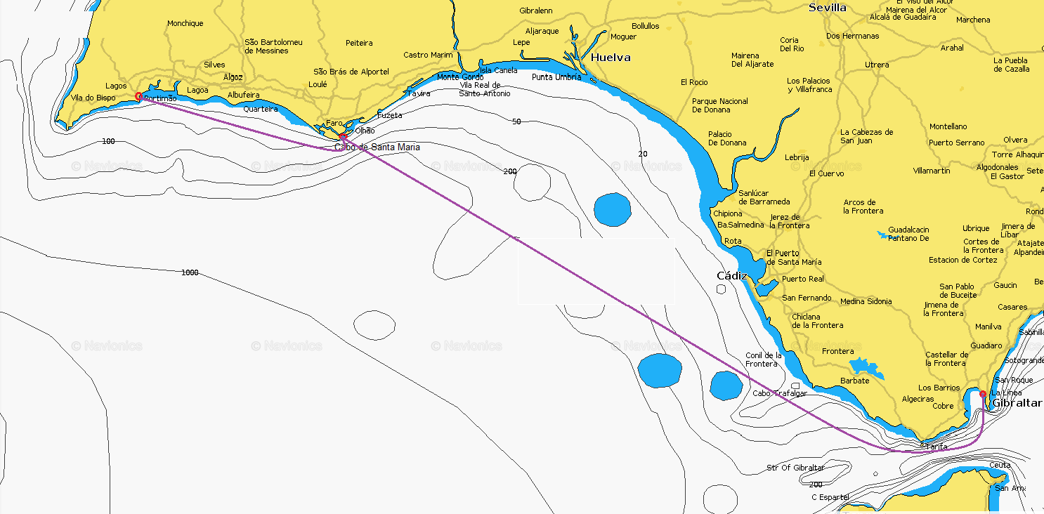 Mais une fois doublé Tarifa, le courant disparait, et la vitesse monte à 6,5 noeuds, puis 7 noeuds, quand nous obliquons vers le nord, jusqu'au Cap Trafalgar.