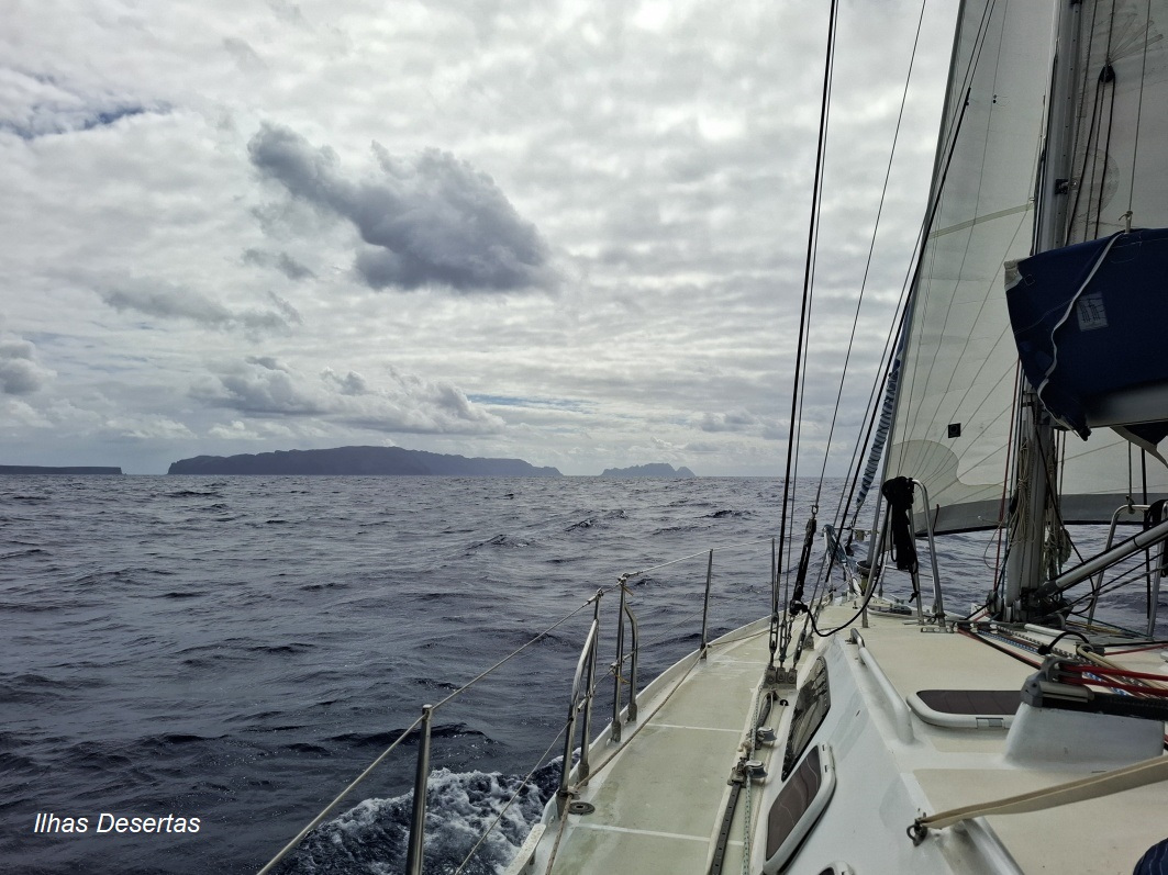 01 octobre : 11h . Nous quittons la marina Quinta do Lorde, et mettons cap au sud, par vent de nord-est, force 4 en moyenne, et temps couvert. Sous grand-voile et génois, alors que nous longeons les Ilhas Desertas, nous apercevons non loin un groupe de baleines-pilotes.