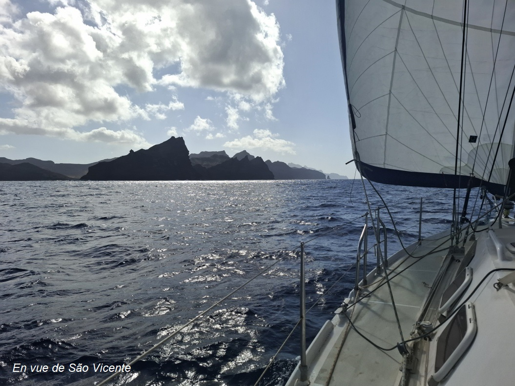 01/12. Péripétie en larguant les amarres: pendille prise dans le propulseur d'étrave. Quelques manoeuvres pour se dégager. Départ sous un ciel gris bouché, quelques ondées. Dans le détroit entre São Vicente et Santo Antão, le vent nous prend, et nous partons sous génois seul, à bonne vitesse.