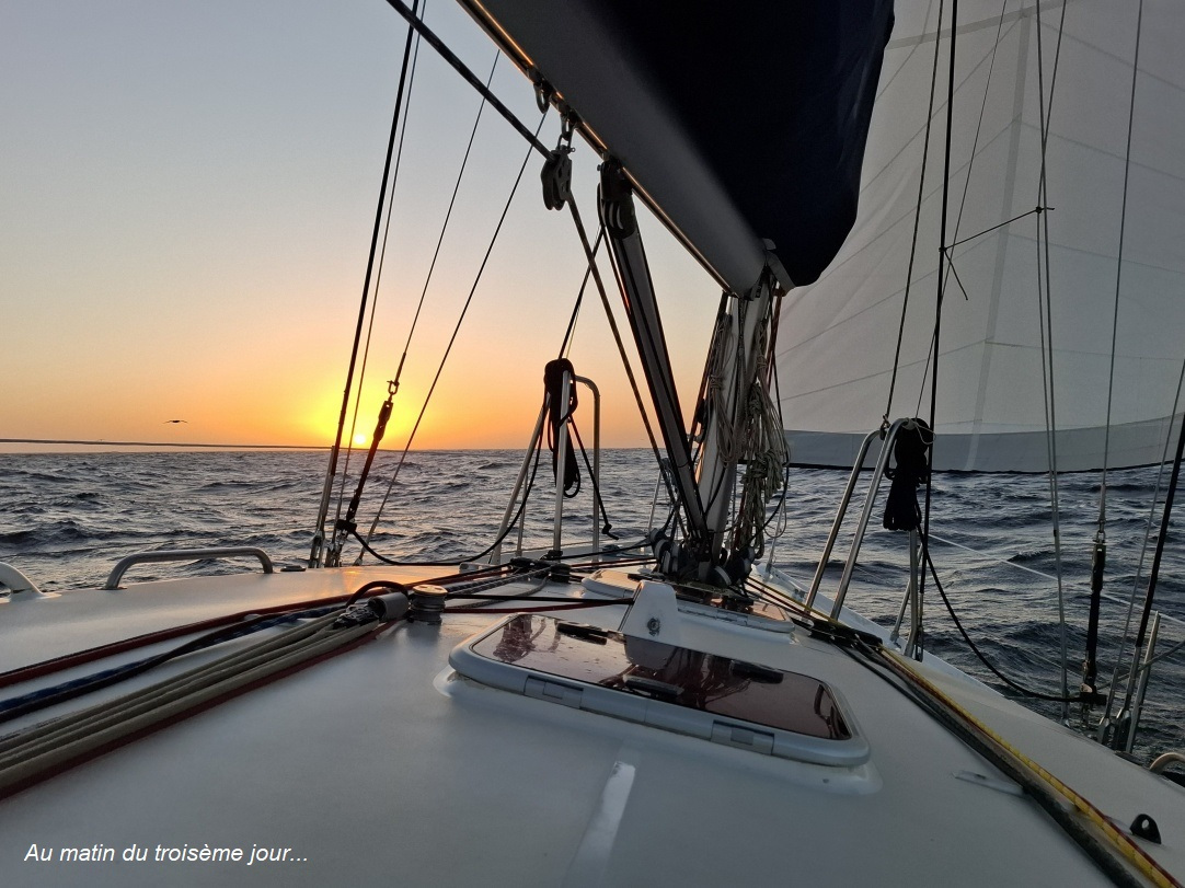 Les deux dernières nuit ont été agréables et confortables : pas de grains pendant les veilles, navigation rapide et en douceur de vague en vague, avec peu de mouvements de gite, et pas de chocs sur les paquets de mer. En bas, le silence de notre marche nous a permis de dormir paisiblement, en profitant à fond des temps de repos.