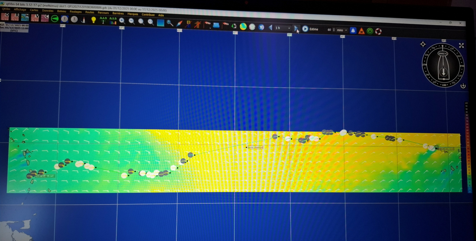 A partir des fichiers météo, j'ai fait un routage informatique (crédible sur le début), qui annonce une durée de traversée entre 15 et 16 jours. Nous verrons ce qu'il en sera...