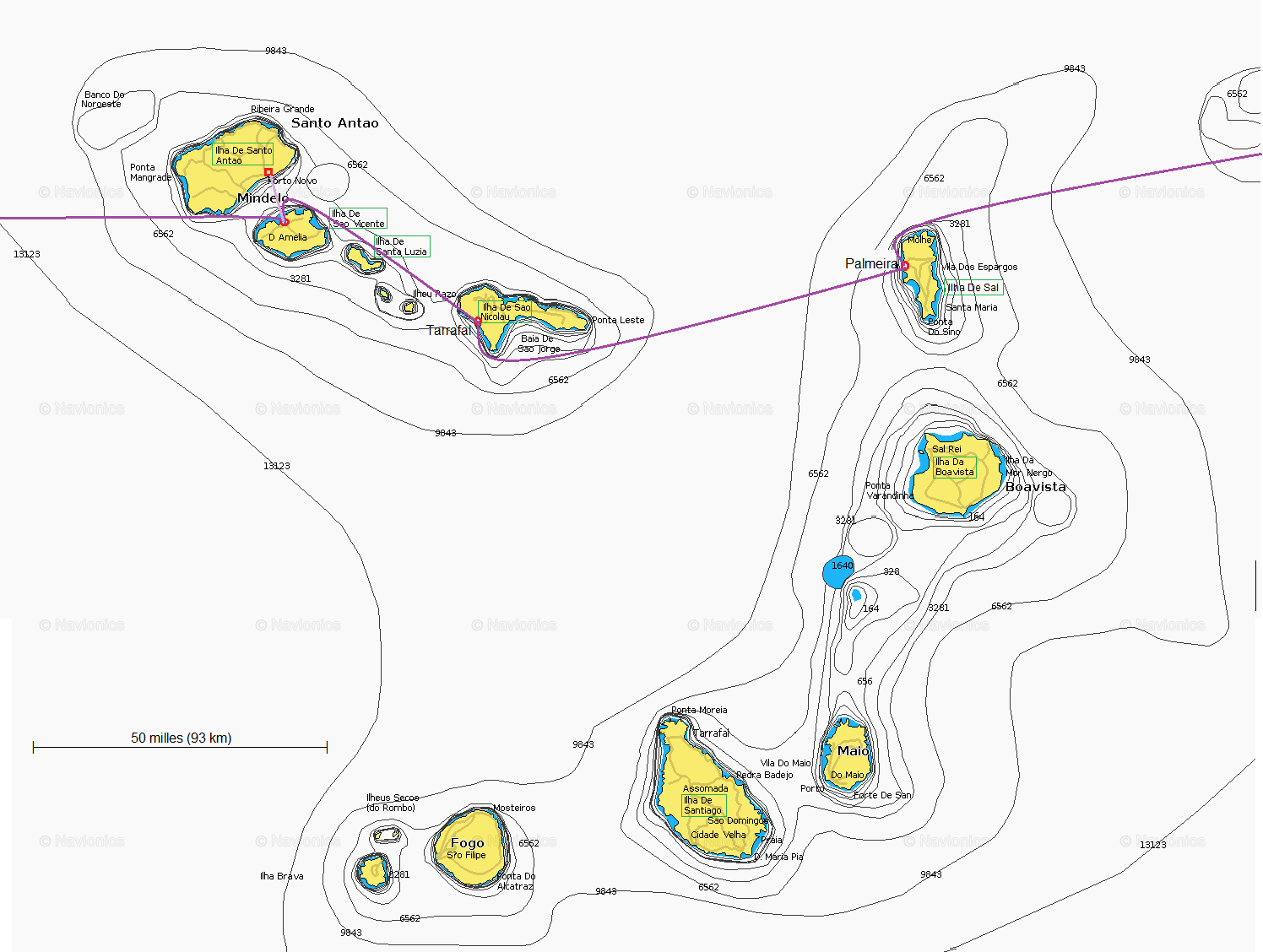 Le trajet direct des Canaries à l'archipel du Cap-Vert représenterait près de 6 jours de navigation. Nous préfèrerons le couper en 2 étapes, chacune de 3 jours, en faisant escale à Nouadhibou, en Mauritanie.