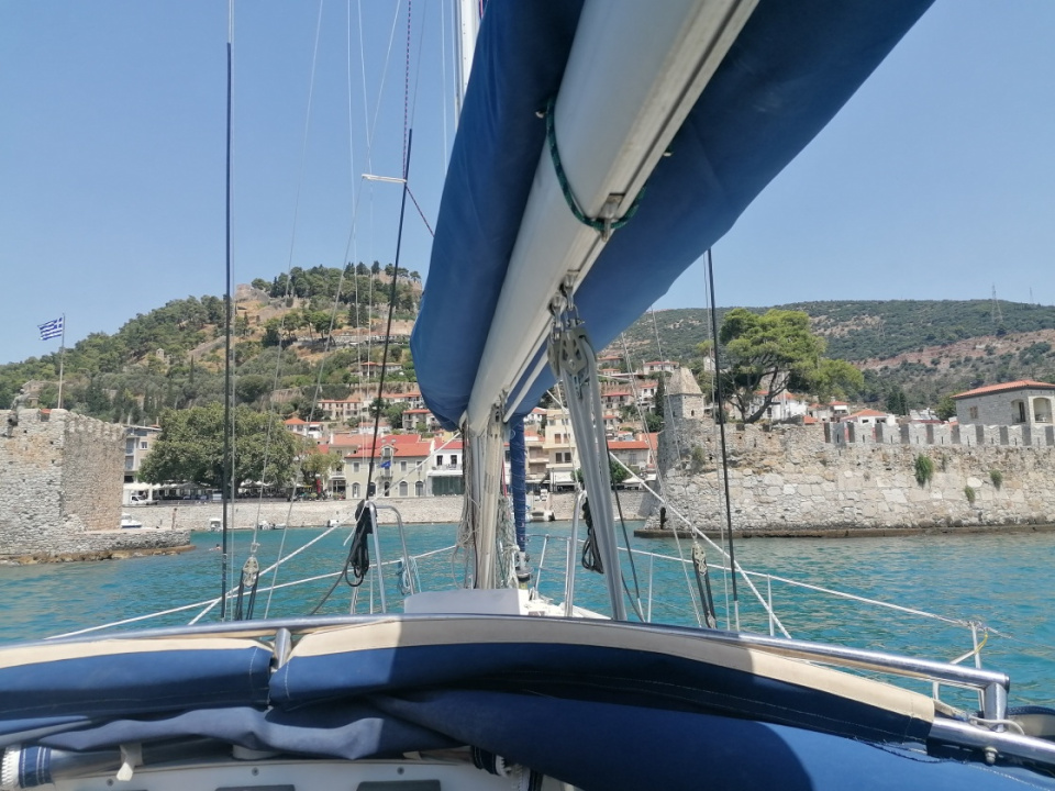 Petite étape pour commencer, vers le mouillage de Korfos. Nous hissons les voiles, le vent très modéré soufflant du nord-ouest, et nous partons au près. Ces conditions très clémentes permettent à Sylvie et à Frédéric de s'essayer à la barre. Mouillage vers 16h15, baignade, descente à terre, et petite visite de la ville.