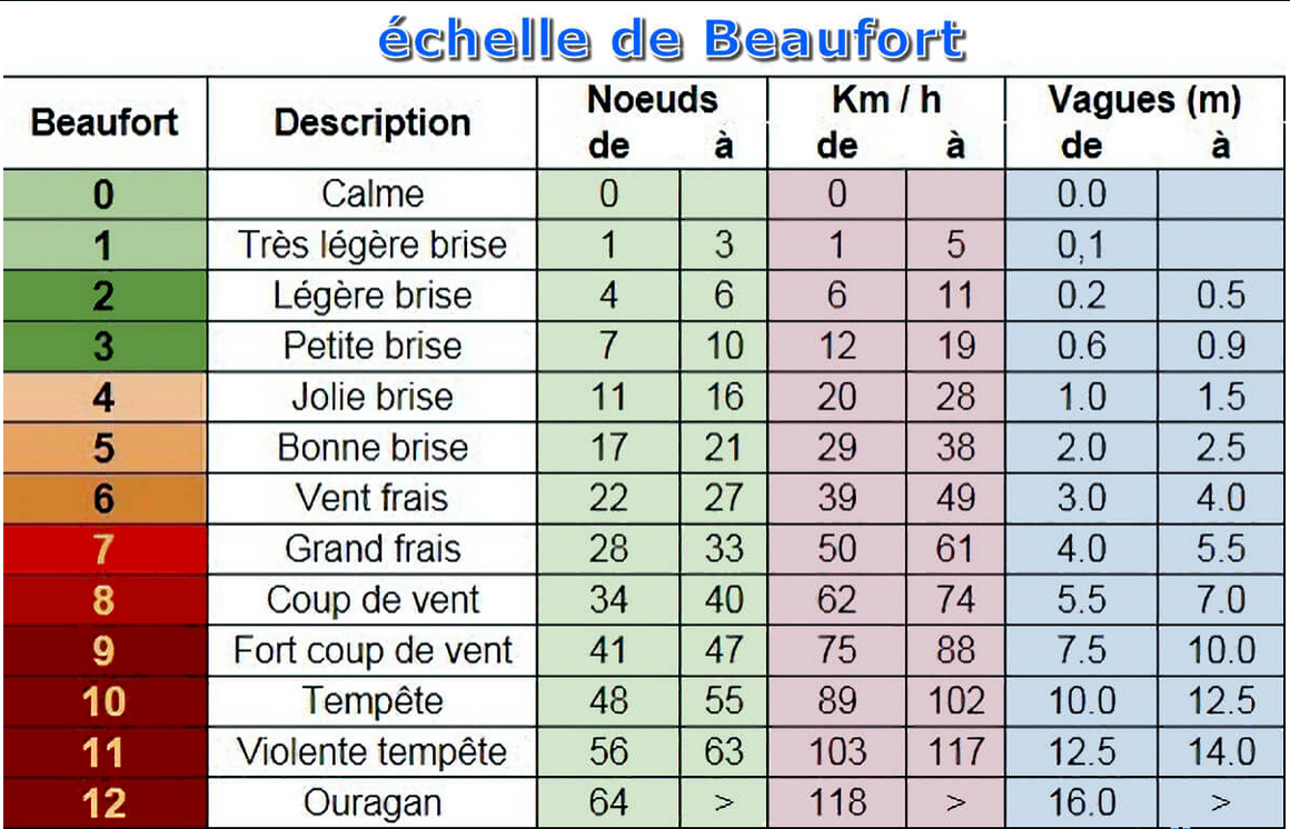 vitesse au près : 5,5 noeuds, à 50° du vent réel , pour 12 noeuds établis