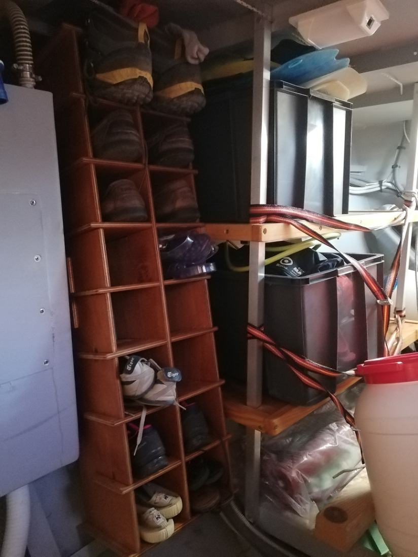 C'est donc durant ce laps de temps la routine habituelle : mise en place de l'accastillage, gonflage de l'annexe, menus travaux, comme l'amélioration de la passerelle, dotée de nouvelles roulettes, la révision du coupe-orin, et l'installation d'un nouveau placard à chaussures dans la soute.