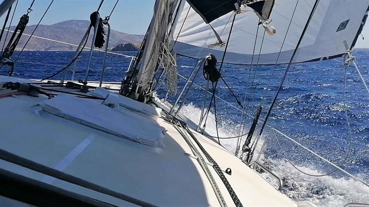 J'avais eu la malheureuse idée de laisser le gennaker roulé à poste, en prévision de jours de vents plus faibles : il est bientôt déchiré, sur toute la chute, par les bourrasques ! Je l'amène en urgence, avant de le ranger dans sa soute. J'avais prévu de le faire réparer à Rhodes, car je savais cette chute cuite par les UV. Cette intervention est plus que jamais d’actualité !