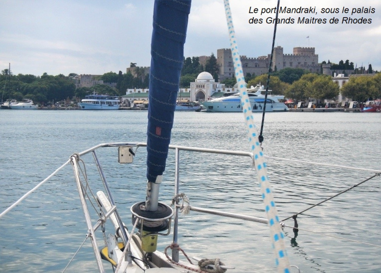 A l'approche de Rhodes, un orage s'abat sur nous, pendant une heure environ. Le soleil est de retour quand nous nous amarrons, vers 15h, au port de Mandraki, au plus près des fortifications médiévales de la ville de Rhodes.