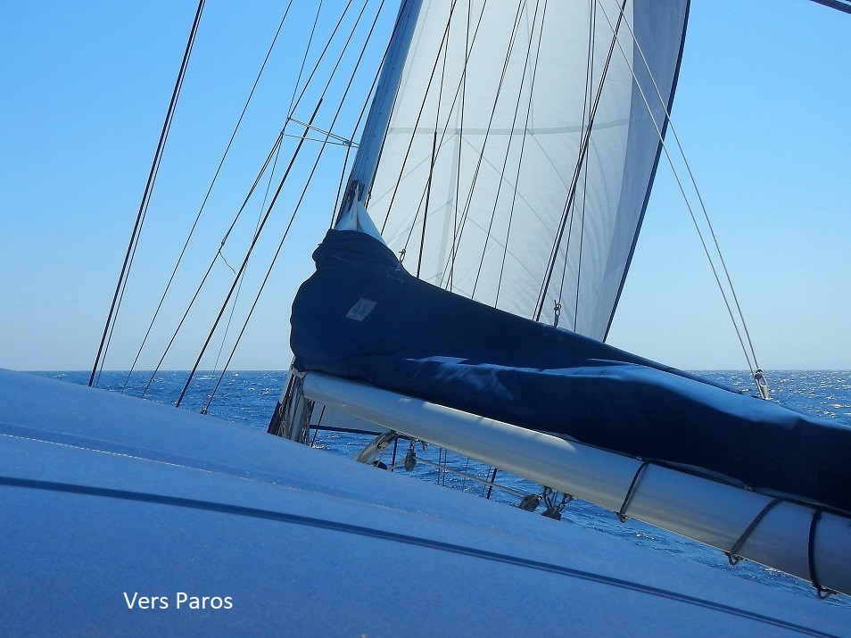 A la sortie du mouillage, nous sommes pris dans le flux de nord, à 30 nœuds, et nous partons sous le seul génois, très réduit. Nous filons entre 5 et 6 nœuds, malgré notre voilure très limitée. Quelques paquets de mer inondent le pont, et l'un d'eux noie l'anémomètre, qui se met à afficher un vent apparent nul ! Heureusement, il reprendra son fonctionnement normal après séchage... En tout début d'après-midi, le vent baisse, comme nous nous rapprochons de Paros, et nous pouvons dérouler tout le génois.