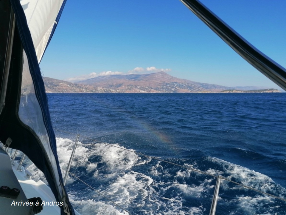Quand nous passons sous le vent de l'île d'Andros, nous nous retrouvons pris dans de violentes rafales, qu'il faut gérer au mieux à la barre.