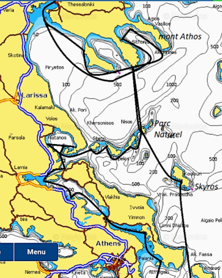 12 Août : Encore une grosse étape de plus de 40 milles, avec des prévisions de vent portant. Malheureusement, il tarde à s'établir, et nous ne pouvons en profiter que dans les 15 derniers milles, à l'approche de Skyros, notre destination.