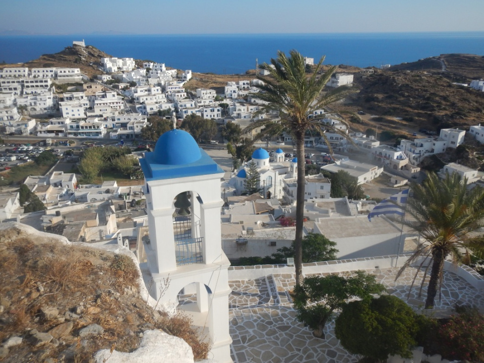 Vent portant de Nord-Est toujours, mais souvent trop faible. Depuis le mouillage sauvage d'Ormos Kolitzani, à Ios, nous montons jusqu'à la ville, qui surplombe la rade du port : harmonie de blanc et bleu, caresse du vent qui nous rafraichit après l'effort...