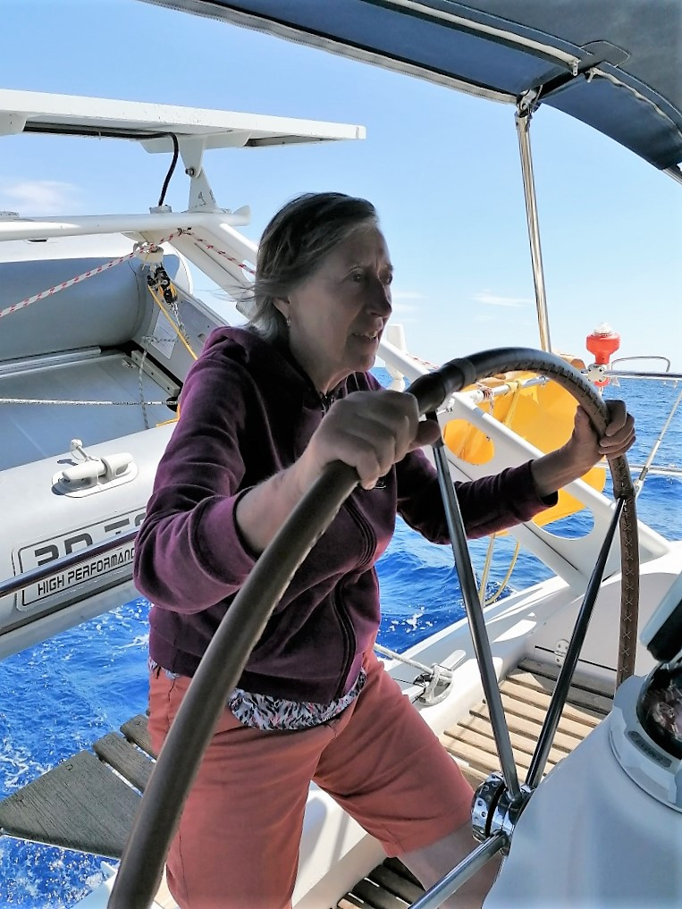 16 juin : Petite traversée jusqu'à Patmos, dans un meltem modéré, qui permet à Marie de s'essayer à la barre. Nous mouillons sur corps mort (payant) dans Ormos Grikou.
