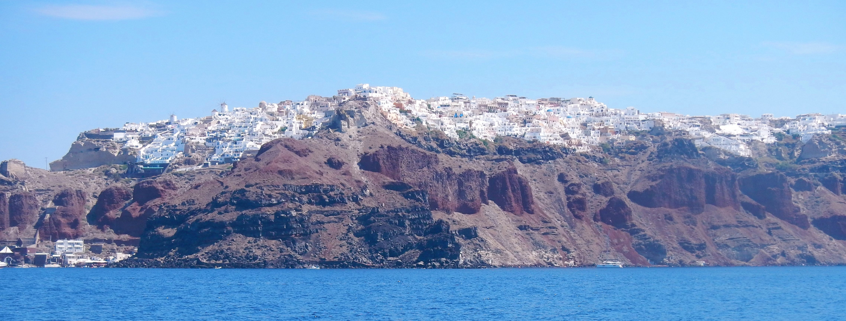 Au-dessus de nous, les falaises de couches de cendres et de roches, sur lesquelles s'étalent les villages blancs. Nous contournons l'ilot central de Néa Kameni (apparu du 16ème au 18ème siècle), où sont visibles les dernières traces de l'activité volcanique, en 1950.