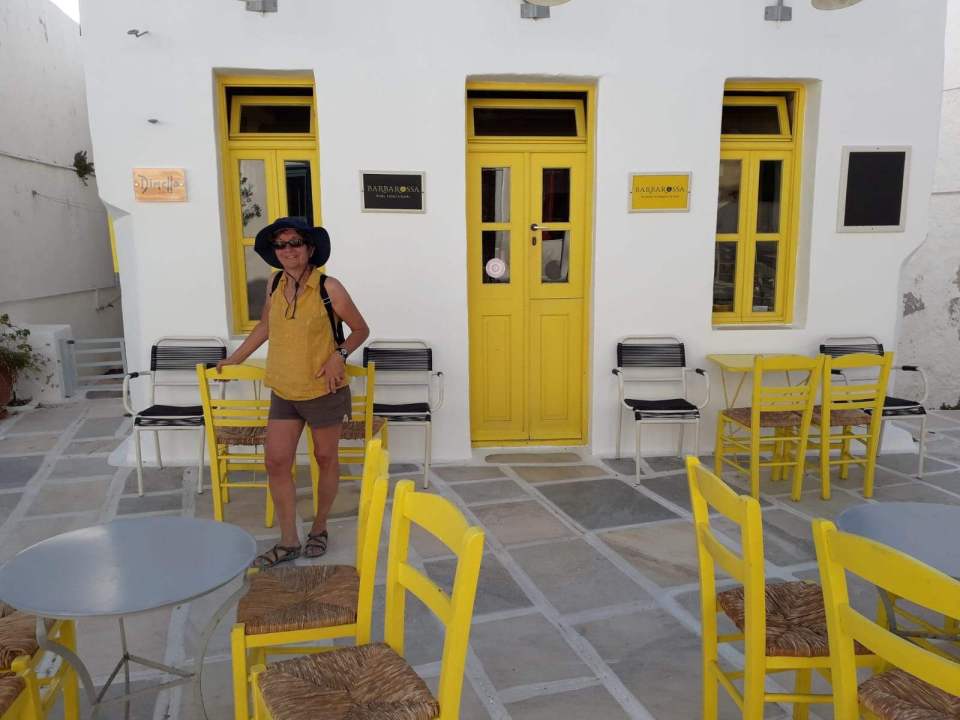 Après un bain rapide, nous débarquons, et attaquons la montée vers le sommet, sur le chemin pavé. Progression pénible sous un soleil encore accablant, mais joie au sommet en contemplant les horizons, plaisir de découvrir les moulins à vent sur leur crête, et moment de réconfort sur la terrasse d'une taverne...
