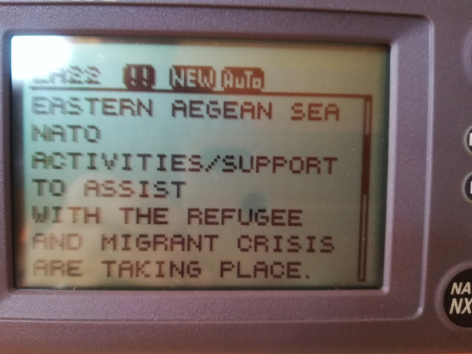 " des activités de l'OTAN pour prendre en charge la crise des réfugiés et des migrants sont en cours. Les navires naviguant dans les zones citées ci-dessus sont priés de rester à l'écart des unités de l'OTAN pour des raisons de sécurité".