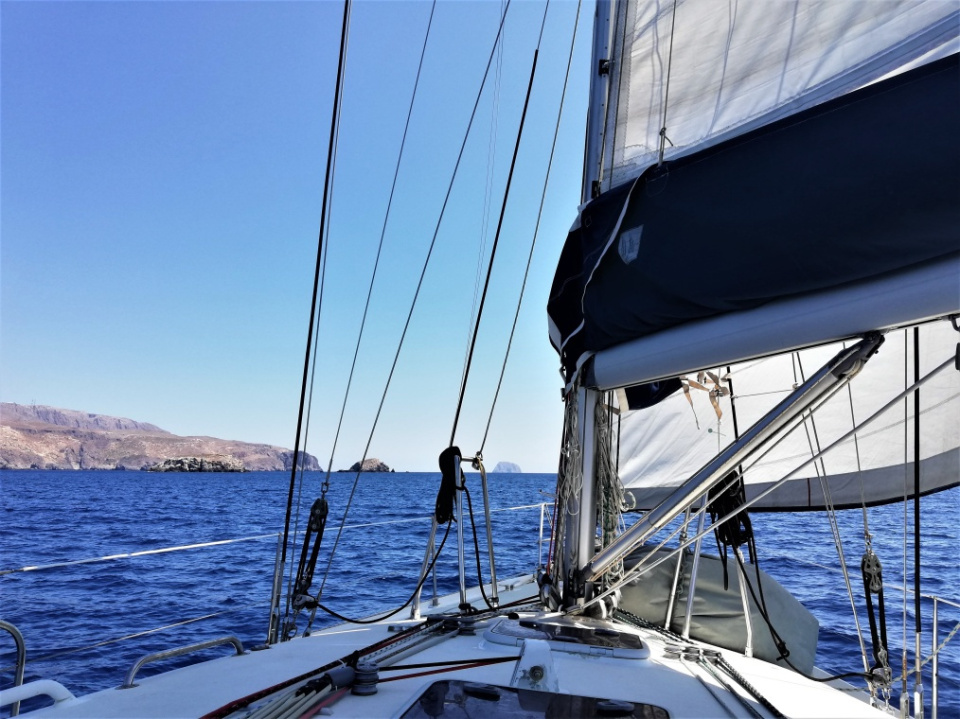 Cette fois c'est la bonne ! Après un peu de moteur, nous atteignons la zone ventée, et pouvons naviguer au travers sous voilure réduite, jusqu'aux parages de l'ile, que nous longeons pour atteindre le mouillage de Kapsali vers 16h.