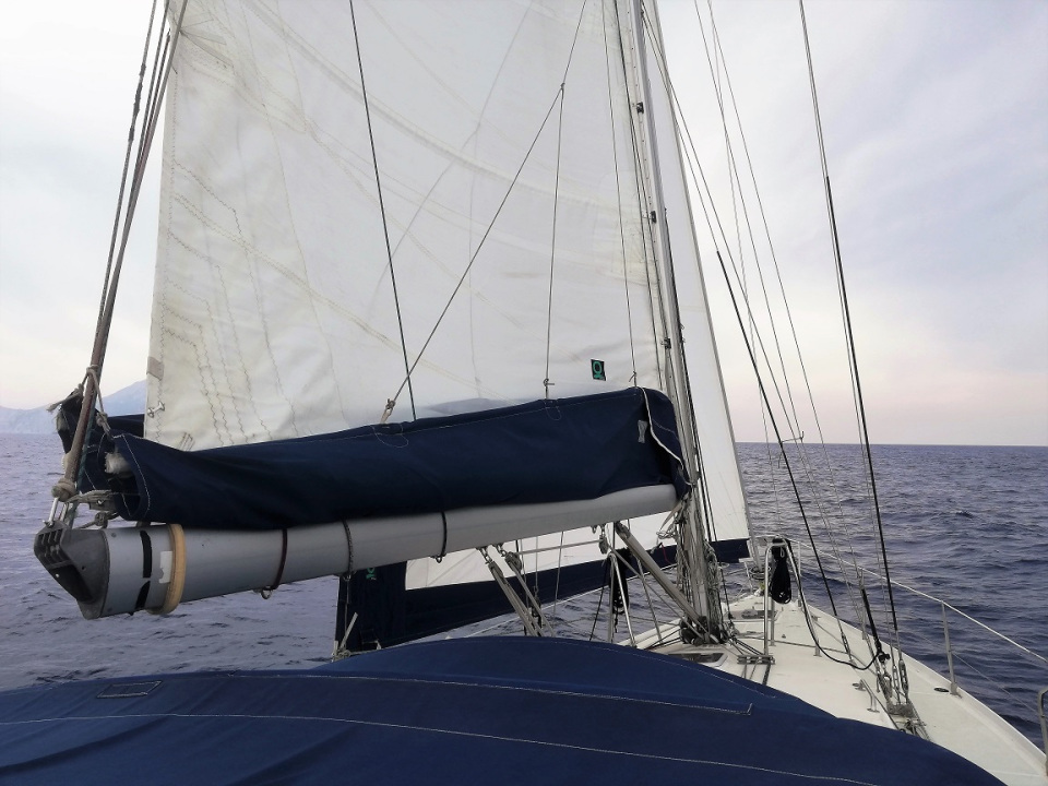 Le vent s'établit en effet assez vite, nord-est, force 3 à 4, et nous pouvons progresser au près, cap au 335. Vers 15h malheureusement, il baisse, et, de plus, vire au nord, ce qui nous oblige de passer au moteur. La progression vers le fameux cap Malée est moins rapide maintenant,et nous ne le doublons que vers 17h.