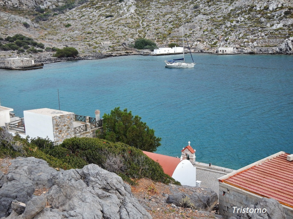 Les 5 personnes que nous apercevons sur une terrasse sont des randonneurs, qui ne tarderont pas à s'éloigner (il faut plus de 10 km de sentiers et de pistes pour rejoindre Diafani,le premier petit port habité). Nous mouillons devant ce hameau, par 4 mètres de fond.